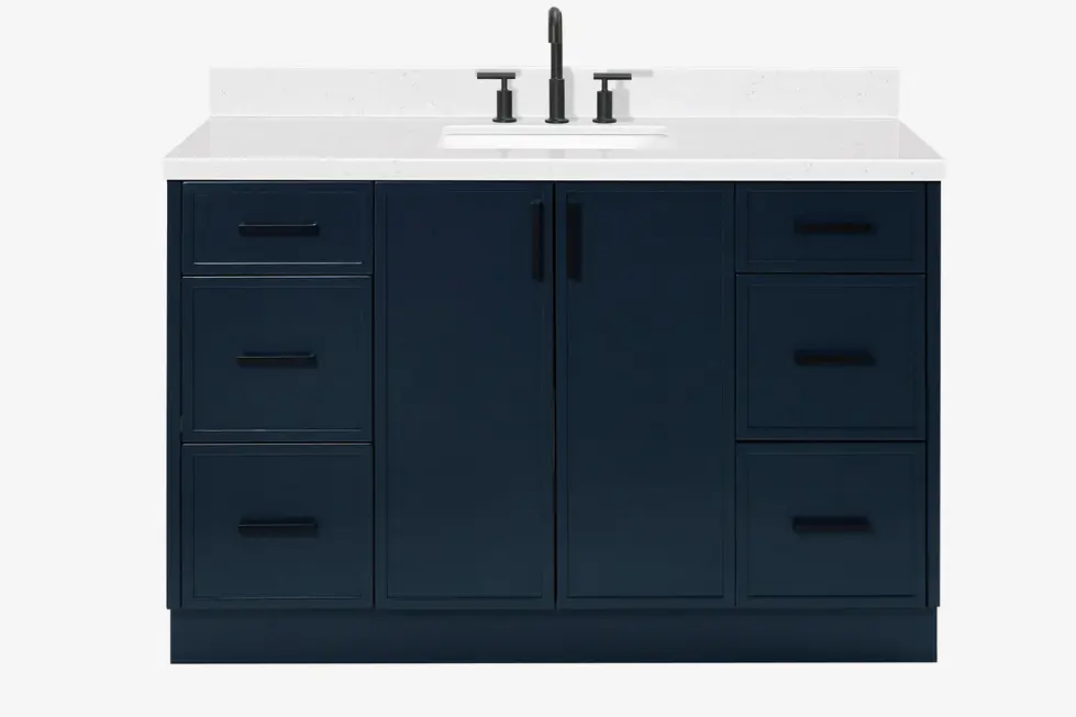 Transform your bathroom with the 55" Blue Slim Vanity from the Kelly collection by ARIEL Bath, available at Luxe Cabinets And Fixtures. Made from solid wood and plywood, it features a slim shaker door and pull-out drawer, offering both style and storage. This vanity with sink keeps your space clutter-free and modern. Choose from various countertops to match your style. Trust Luxe Cabinets for top quality.